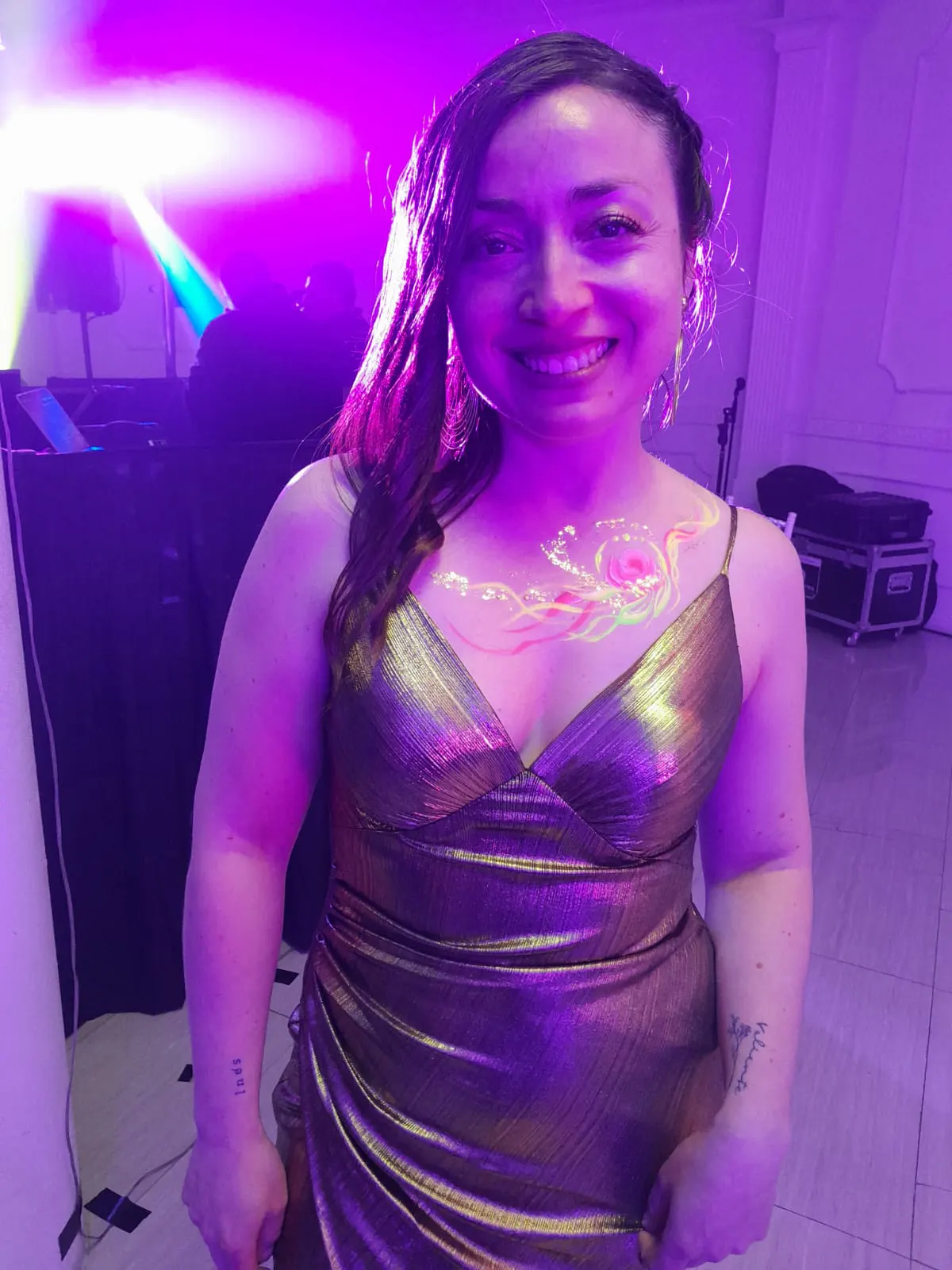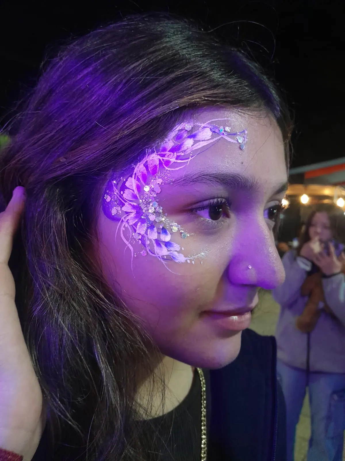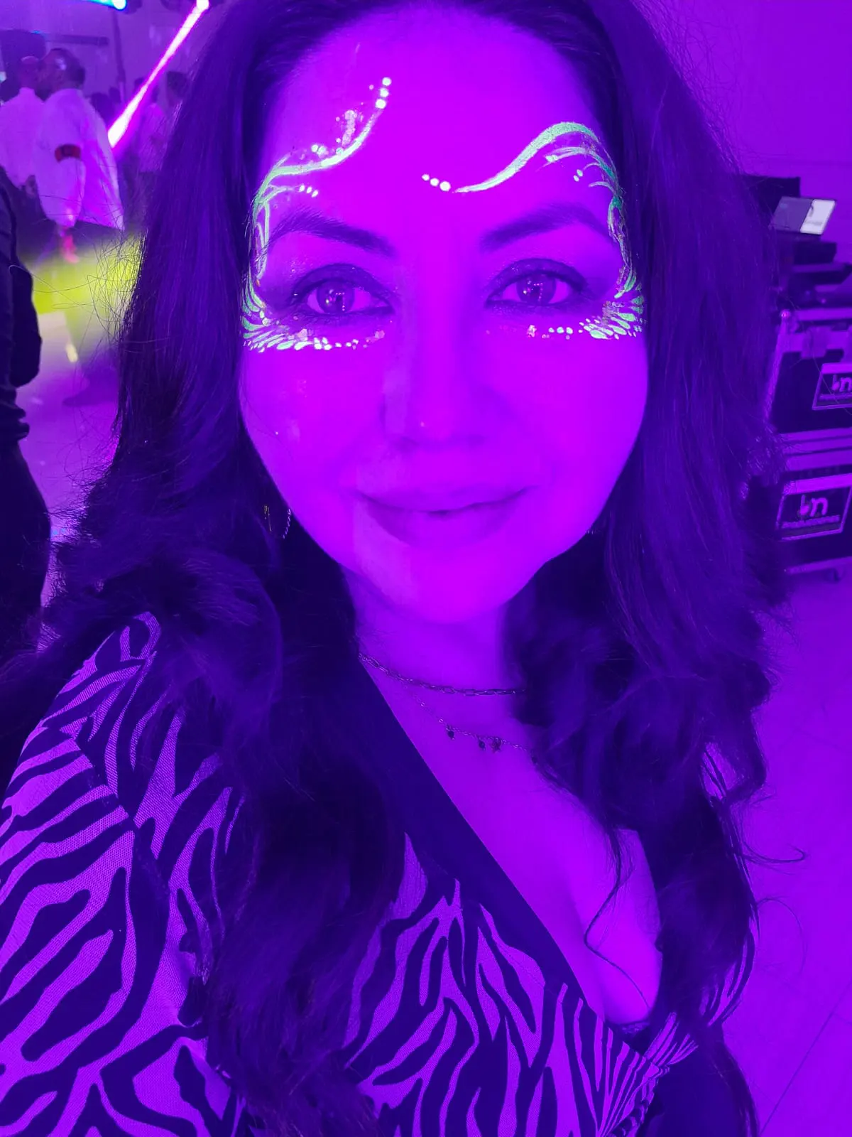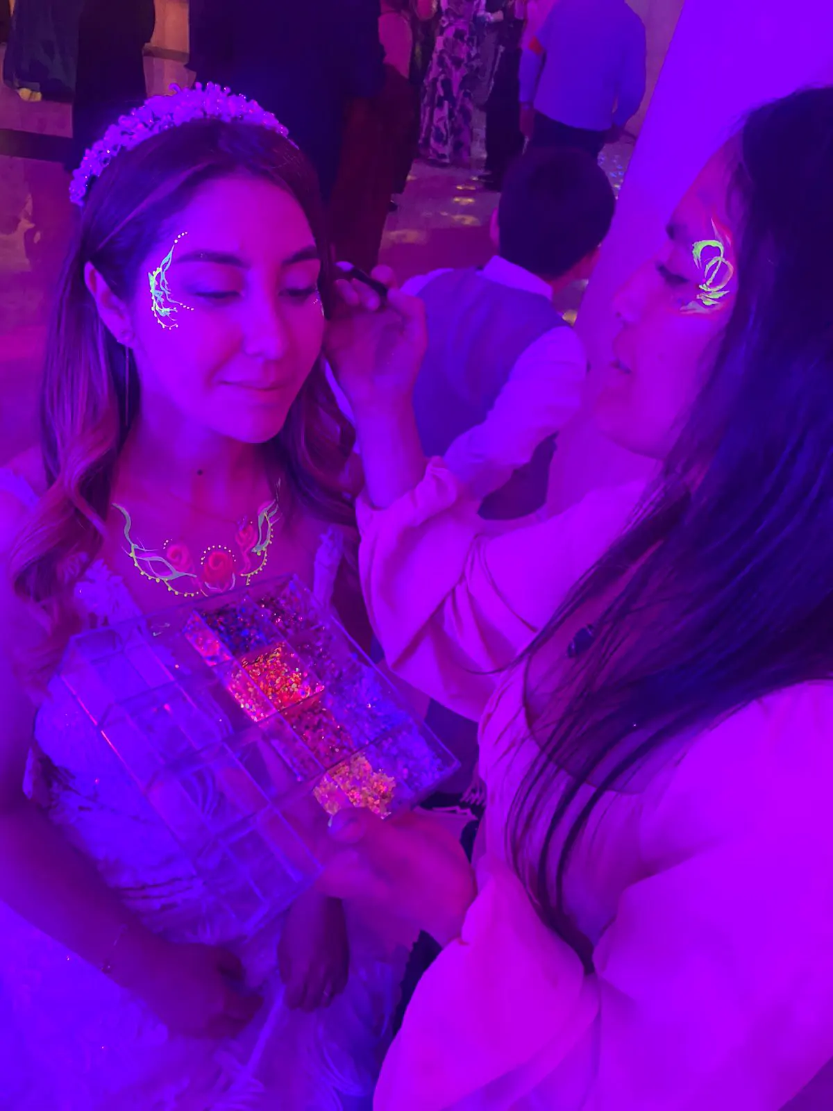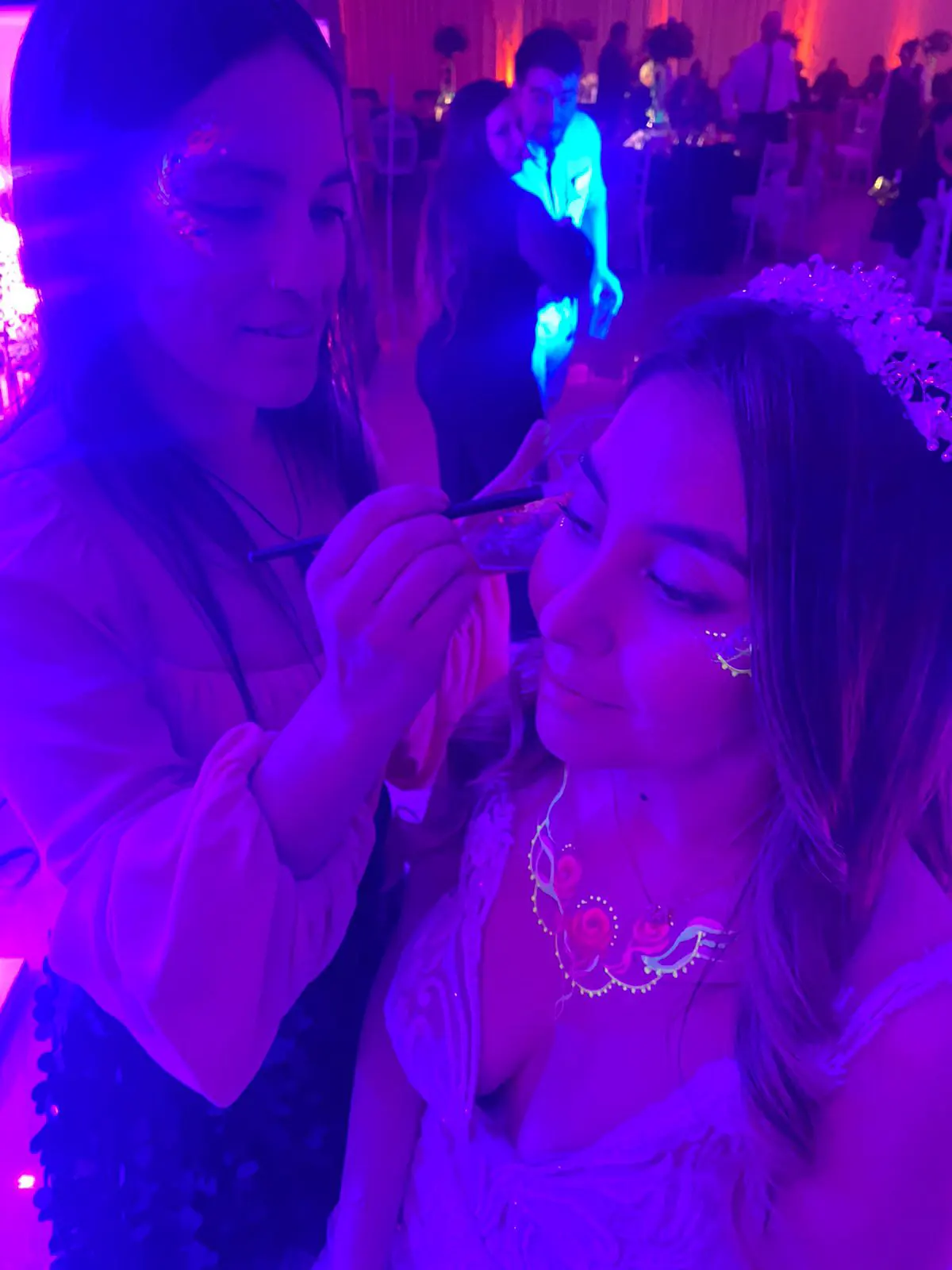 Maquillaje que brilla bajo luz UV, perfecto para fiestas nocturnas, matrimonios, eventos juveniles y celebraciones temáticas.